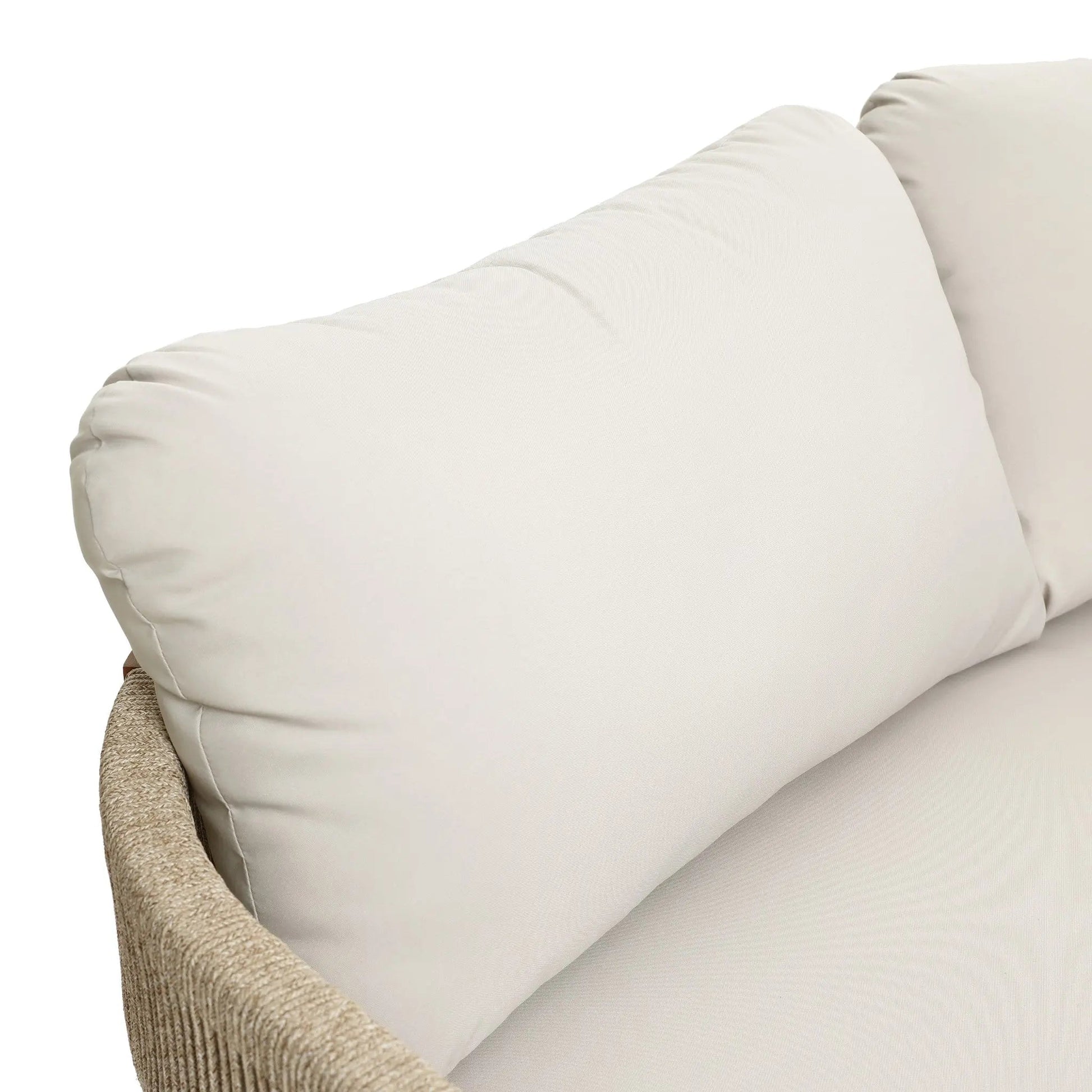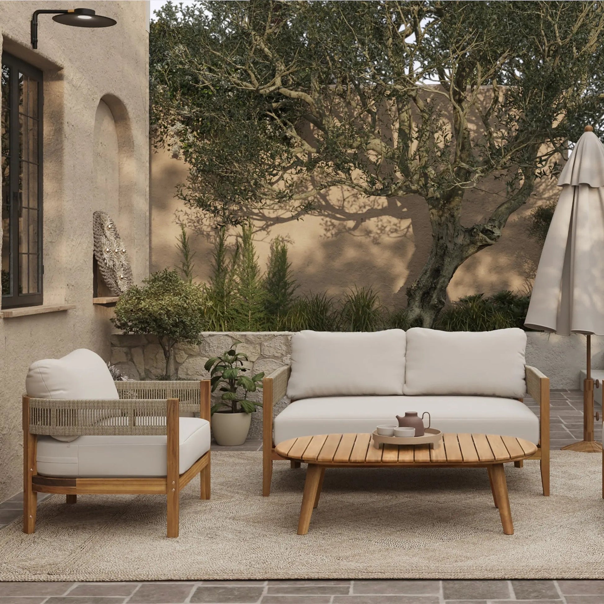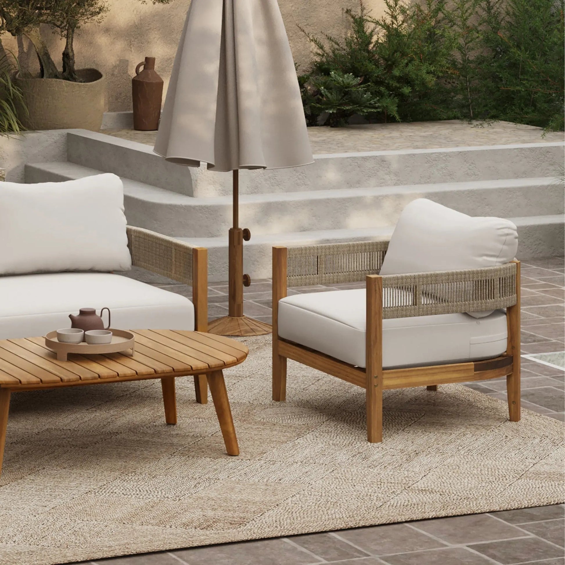 The acacia wood frame provides strength and natural resistance to outdoor use. Rope details on the armrests add texture and support. The coffee table features a slatted surface for water drainage and rounded corners for safety.